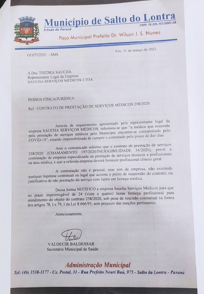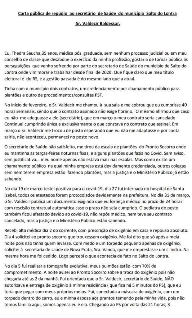 “Eu, Thedra Saucha,35 anos, médica pós graduada, sem nenhum processo judicial ou em meu conselho de classe que desabone o exercício da minha profissão, gostaria de tornar pública as perseguições que venho sofrendo por parte do secretario de Saúde do município de Salto do Lontra onde vim morar e trabalhar desde final de 2020. Que fique claro que meu título eleitoral é do RS, e a gestão passada é do mesmo lado que a atual.