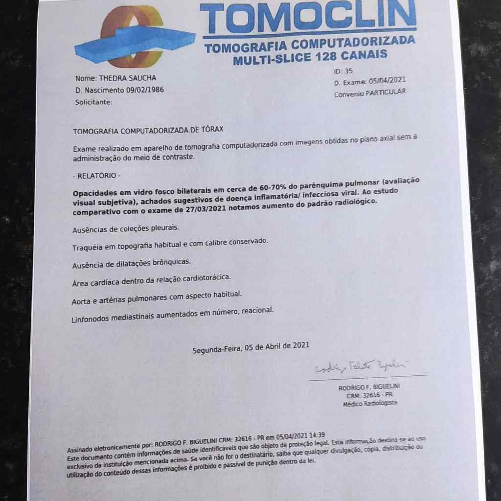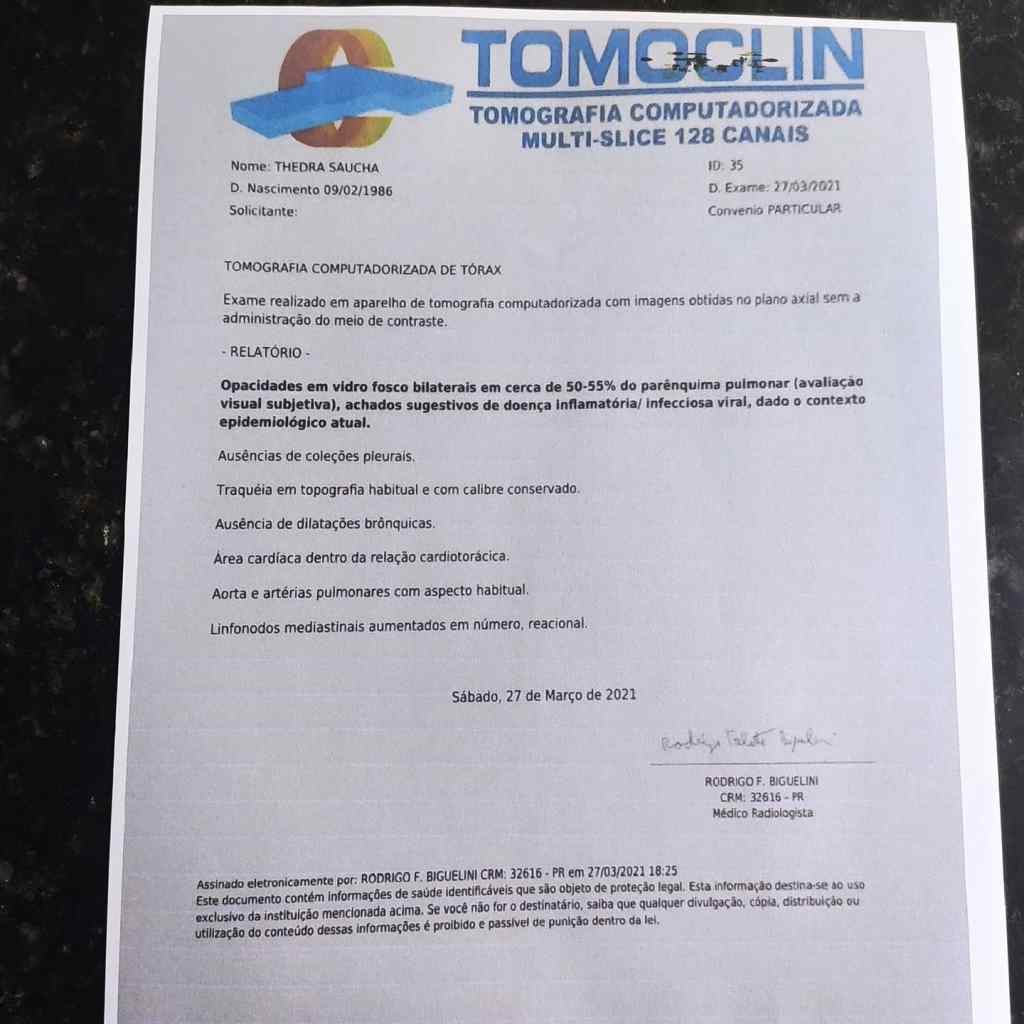 No dia 5 fui realizar a tomografia evolutiva, meus pulmões estão com 70% de comprometimento. A noite avisei ao Pronto Socorro sobre a troca do oxigênio pois não chegaria até as 2 da manhã. Fui orientada que o Sr. Valdecir, secretário de Saúde, NÃO autorizava e entrega de oxigênio à minha residência ( que fica há 5 minutos do PS), que eu teria que pegar com meus próprios meios. Fui, conectada a máscara de oxigênio, com um torpedo dentro do carro, eu e minha esposa aos prantos temendo pela minha vida, pois não temos família aqui, somos apenas eu e ela. Chegando ao PS por volta das 21 horas, 3 ambulâncias ociosas. Prontamente a equipe de plantão virou o banco do meu carro e alguns com lágrimas nos olhos diziam “ sinto muito dra.”.