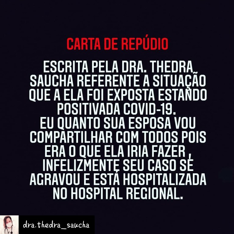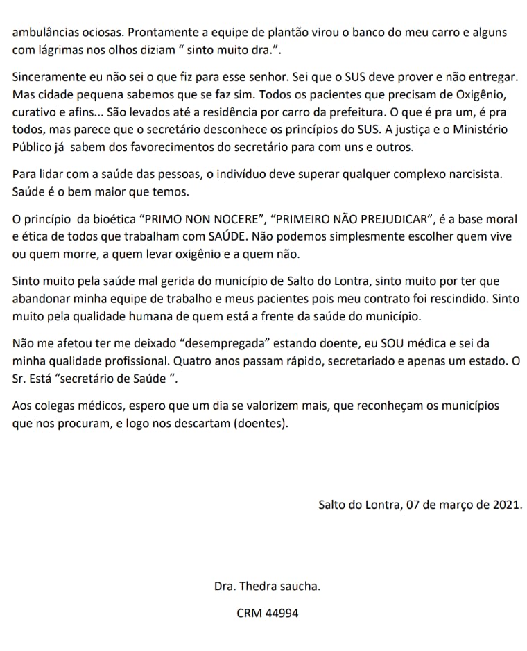“Eu, Thedra Saucha,35 anos, médica pós graduada, sem nenhum processo judicial ou em meu conselho de classe que desabone o exercício da minha profissão, gostaria de tornar pública as perseguições que venho sofrendo por parte do secretario de Saúde do município de Salto do Lontra onde vim morar e trabalhar desde final de 2020. Que fique claro que meu título eleitoral é do RS, e a gestão passada é do mesmo lado que a atual.