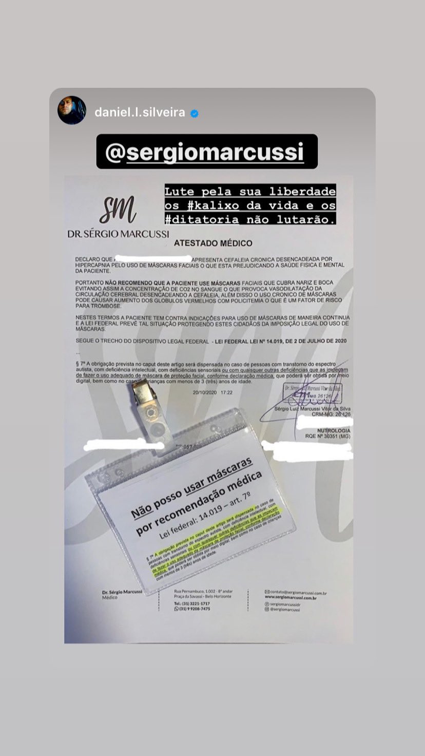 Negacionista da pandemia, escreveu que “o uso permanente de uma máscara produz doenças nas vias respiratórias superior e inferior, auto-contaminação, proliferação de microrganismos, pneumonia.”