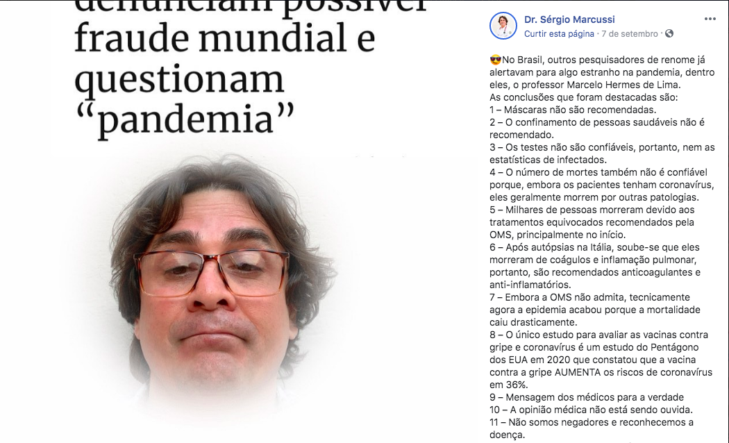 Também espalha fake news, como a de que “o único estudo para avaliar as vacinas contra gripe e coronavírus é um estudo do Pentágono dos EUA em 2020 que constatou que a vacina contra a gripe AUMENTA os riscos de coronavírus em 36%”.