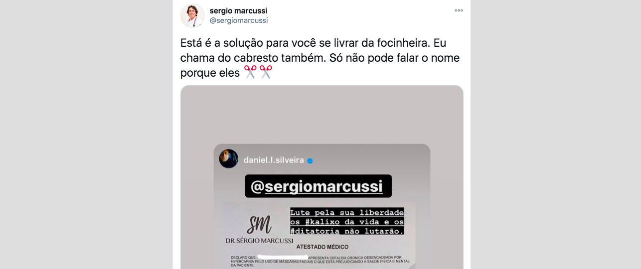O médico Sérgio Marcussi está prometendo atestados para quem não quiser usar máscaras contra o coronavírus.