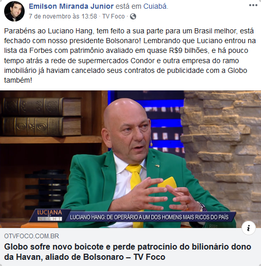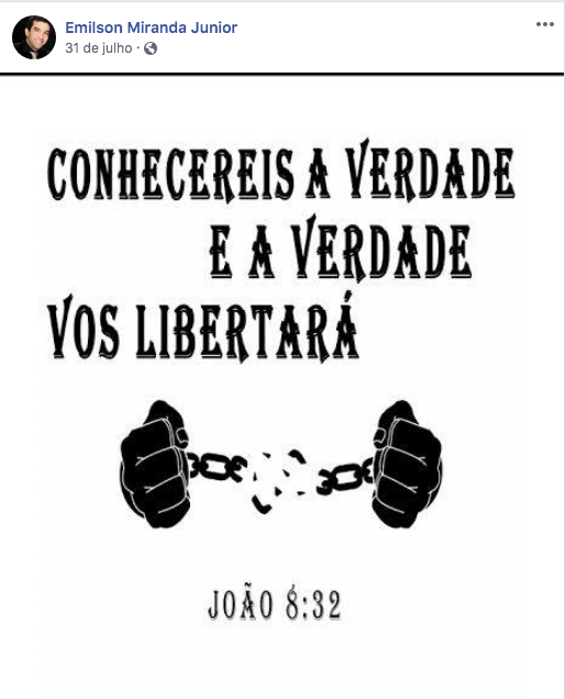 A postagem mais recente de Emilson no Facebook deixa claro que se trata de um cidadão de bem, temente a Deus, bolsonarista e fã do Véio da Havan: