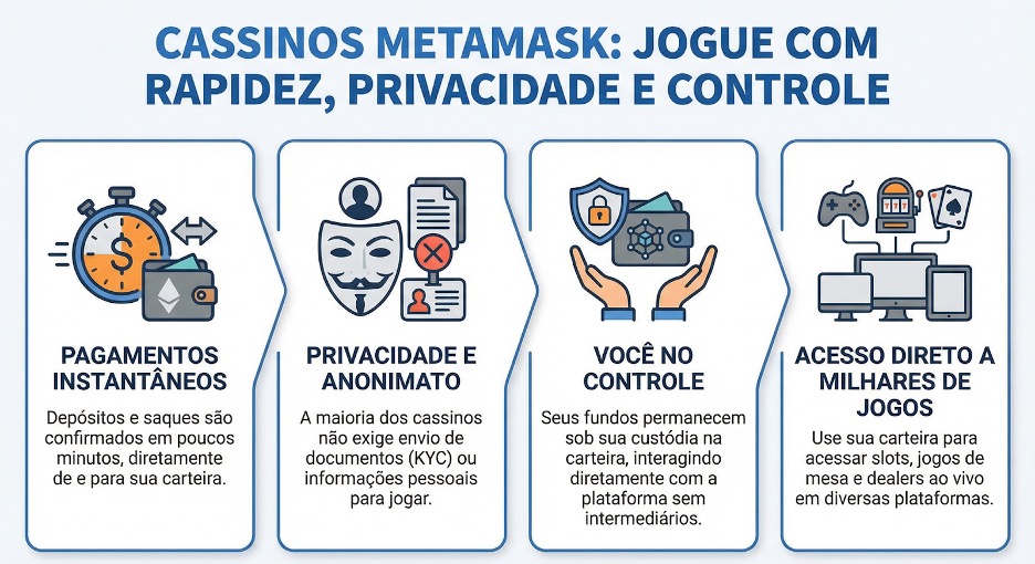 Sim, você pode usar sua carteira MetaMask para depositar fundos em cassinos cripto compatíveis, jogar jogos e sacar seus ganhos. O processo é simples e geralmente mais rápido que métodos de pagamento tradicionais.