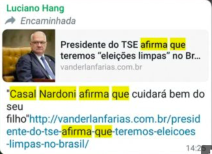 Em 12 de maio, Hang encaminhou ao grupo uma reportagem com o título: “Presidente do TSE afirma que teremos eleições limpas no Brasil”, e, de forma irônica, enviou mensagem em que comparava Edson Fachin ao casal Nardoni: “Casal Nardoni afirma que cuidará bem do seu filho”. Os Nardoni foram condenados pelo homicídio doloso qualificado de Isabella Nardoni, então com 5 anos de idade.