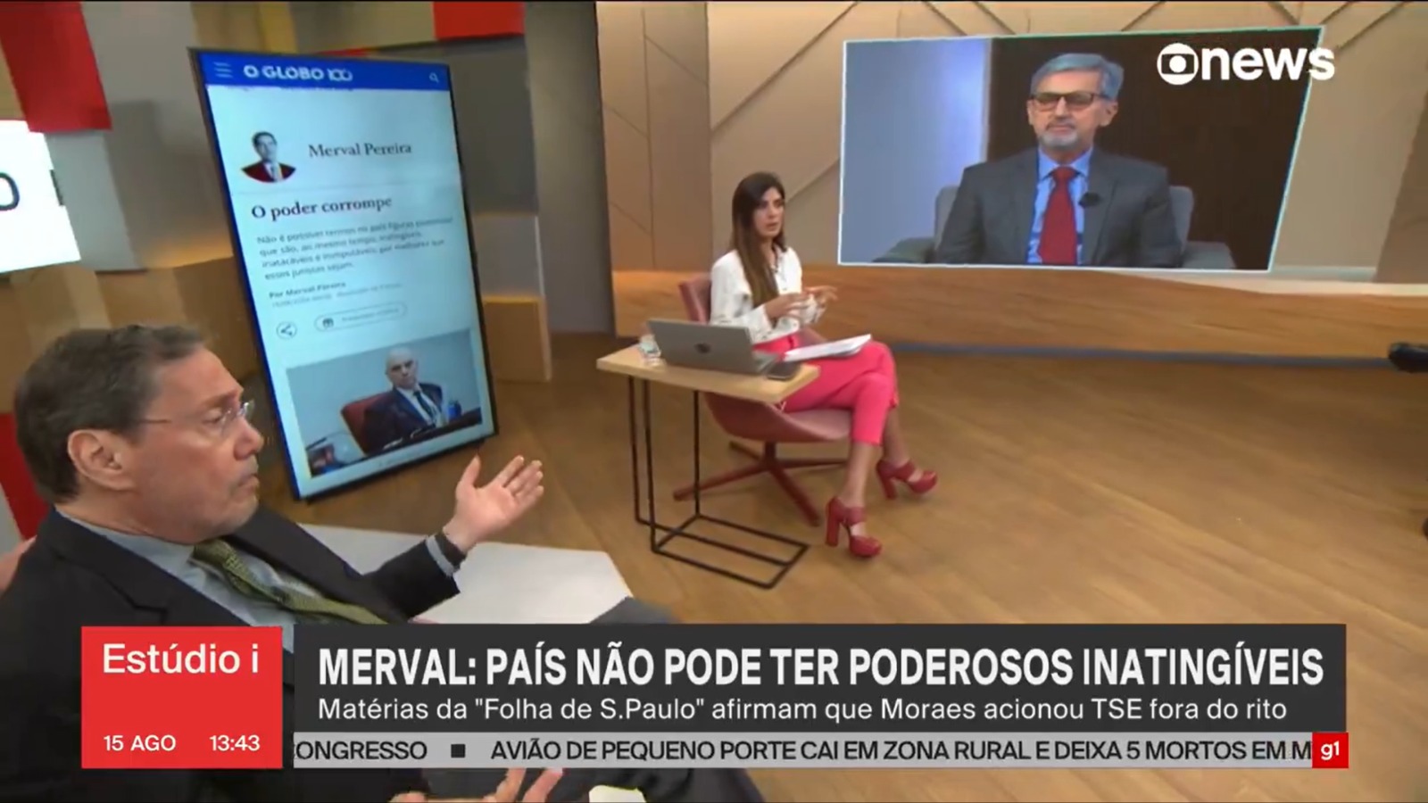 O comentarista de política e economia da GloboNews, Valdo Cruz, ficou incomodado nesta quinta-feira (15) ao ser interrompido pelo jornalista Merval Pereira durante o programa Estúdio I.