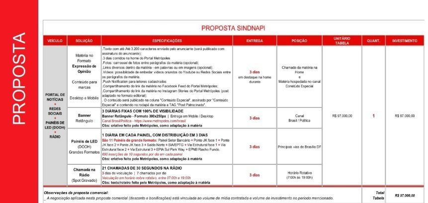 O assessor de comunicação do Sindnapi, Renê Gardim, respondeu positivamente. Em um documento detalhado a que o DCM teve acesso, o Metrópoles sugere como “solução” para o Sindnapi “se posicionar” uma “matéria no formato Expressão de Opinião”, com “três dias de destaque na home” e exposição em outras mídias do grupo, como banners, painéis de LED e chamada na rádio pelo valor de R$ 97 mil.
