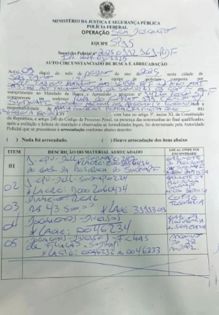 Os veículos apreendidos, assim como outros bens luxuosos, eram de outras pessoas investigadas, como Felipe Macedo Gomes, ex-presidente da Amar Brasil Clube de Benefícios (ABCB), Anderson Cordeiro, dirigente da Masterprev, Igor Dias Delecrode, desenvolvedor de tecnologias que atuou para vários desses órgãos, e Américo Monte, presidente da ANDAP. Para comprovar a falsidade da matéria do Metrópoles atribuindo a propriedade ao Sindnapi, o auto de apreensão da PF mostra claramente que por lá foram apreendidos apenas dois computadores, duas pastas de documentos e R$ 43 mil em espécie no cofre da tesouraria do sindicato, conforme imagem acima.