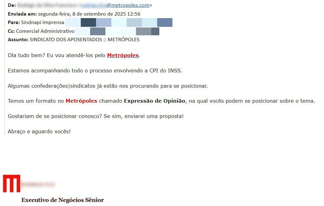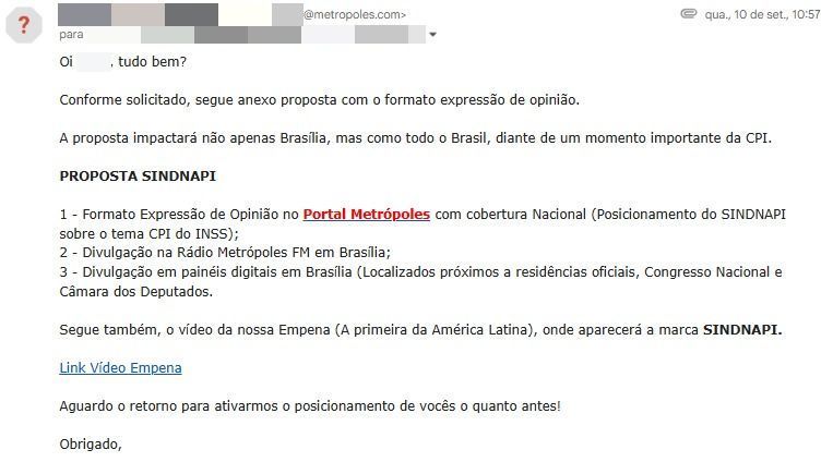 No dia 8 de setembro, um “executivo de negócios sênior” do Metrópoles entrou em contato por email com o Sindnapi afirmando que “temos um formato no Metrópoles chamado Expressão de Opinião, na qual vocês podem se posicionar sobre o tema”. “Gostariam de se posicionar conosco? Se sim, enviarei uma proposta!”.