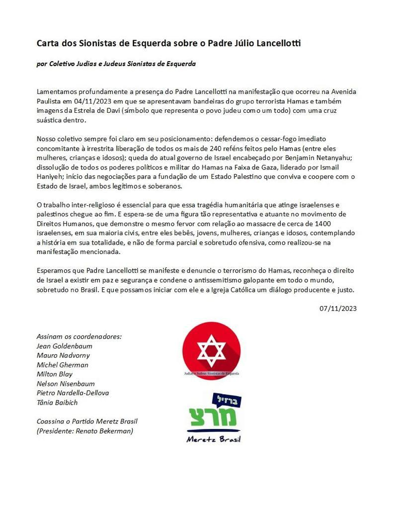 Em nota, os grupos associaram a presença do padre no evento às “bandeiras do Hamas e também imagens da estrela de Davi com uma cruz suástica dentro”. Pedem que “Lancellotti se manifeste e denuncie o terrorismo do Hamas, reconheça o direito de Israel a existir em paz e segurança e condene o antissemitismo galopante em todo mundo, sobretudo no Brasil”.