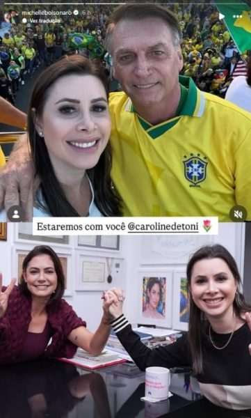 Nas redes sociais, Michelle compartilhou fotos ao lado de Caroline e também imagens da deputada com o ex-presidente Jair Bolsonaro. Ao comentar as publicações, a presidente do PL Mulher indicou respaldo político: “Estaremos com você”.