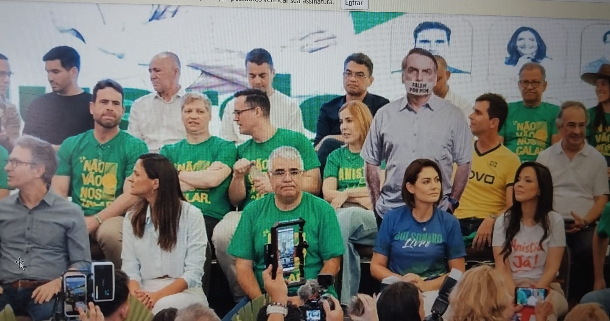 (A foto ao alto, de Michelle ao lado de Girão, é do encontro em Fortaleza. A imagem de Bolsonaro que aparece atrás dela é de papelão. Preso, o chefe da extrema-direita virou um boneco, enquanto Michelle tenta assumir a liderança da extrema-direita.)