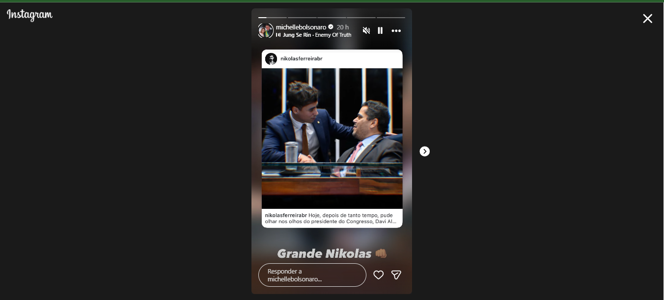 Michelle Bolsonaro elogiou Nikolas Ferreira nesta quinta-feira (9). Horas antes, Davi Alcolumbre (União-AP) marcou para o dia 30 a sessão do Congresso que vai analisar o veto de Lula ao PL da dosimetria. No Instagram, por sua vez, a ex-primeira-dama escreveu “Grande Nikolas” ao compartilhar uma publicação do deputado mineiro com o presidente do Senado.