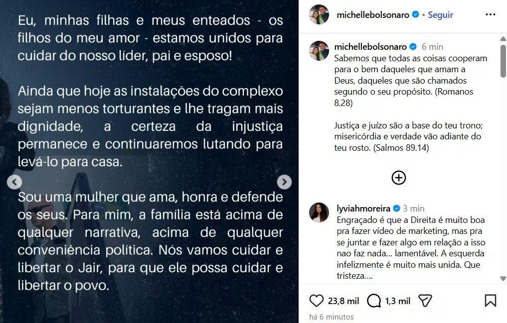 Apesar dessas mudanças, Michelle manteve a parte do texto onde reiterou seu compromisso em continuar lutando para levar o marido para casa. Ela também pediu aos seguidores para não a julgarem pessoalmente, escrevendo: “Àqueles que também amam e defendem o meu amor, o nosso líder, peço que não me levem ao tribunal do julgamento pessoal, que não se apressem em me julgar ou a criar rótulos de conotação política”.