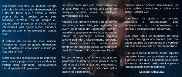 Em sua postagem, Michelle não fez menção direta aos encontros com Moraes e Gilmar, mas falou sobre a importância de agir com discernimento, pedindo que “não se apressassem em me julgar”. Ela disse que sua luta pela prisão domiciliar de Bolsonaro continuará, embora tenha reconhecido que a transferência para a Papudinha representasse um local “menos prejudicial” para o ex-presidente.