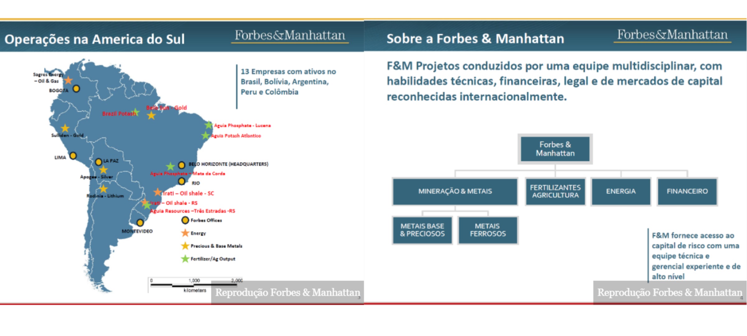 O histórico do Forbes & Manhattan vai mais longe, com a venda de uma mineradora de ouro na Bahia nos anos 2000. O banco de Stan Bharti foi o primeiro a desenvolver, via sua antiga empresa Desert Sun, a estrutura hoje operada pela também canadense Yamana Gold. Em 2006, a Yamana adquiriu os direitos de exploração em Jacobina (BA), então controlados pelo Forbes & Manhattan, por 750 milhões de dólares canadenses — mais de R$ 3 bilhões, na cotação atual.
