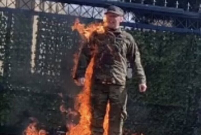 Em um vídeo transmitido ao vivo em um site de streaming, Twitch, o homem se identificou e falou que estava “prestes a se envolver em um ato extremo de protesto”. Depois de se incendiar, gritou repetidamente “Palestina Livre”.