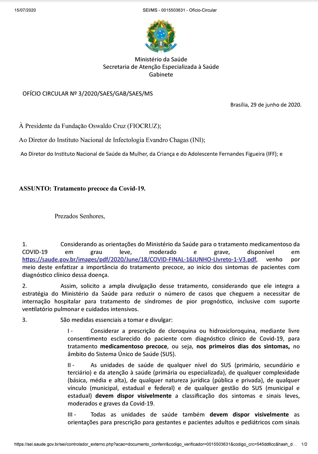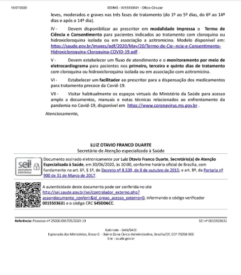“Venho por meio deste enfatizar a importância do tratamento precoce, ao início dos sintomas de pacientes com diagnóstico clínico dessa doença”, diz o documento assinado por Luiz Otávio Franco Duarte, secretário de Atenção Especializada.