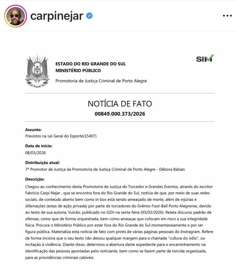 O Ministério Público do Rio Grande do Sul abriu uma investigação sobre o escritor Fabrício Carpinejar após ele ter sido alvo de ameaças de morte e ataques em redes sociais. O caso foi encaminhado à Promotoria de Justiça Criminal de Porto Alegre, com base em conteúdo compartilhado por Carpinejar, que foi atacado por torcedores do Grêmio Foot-Ball Porto Alegrense.