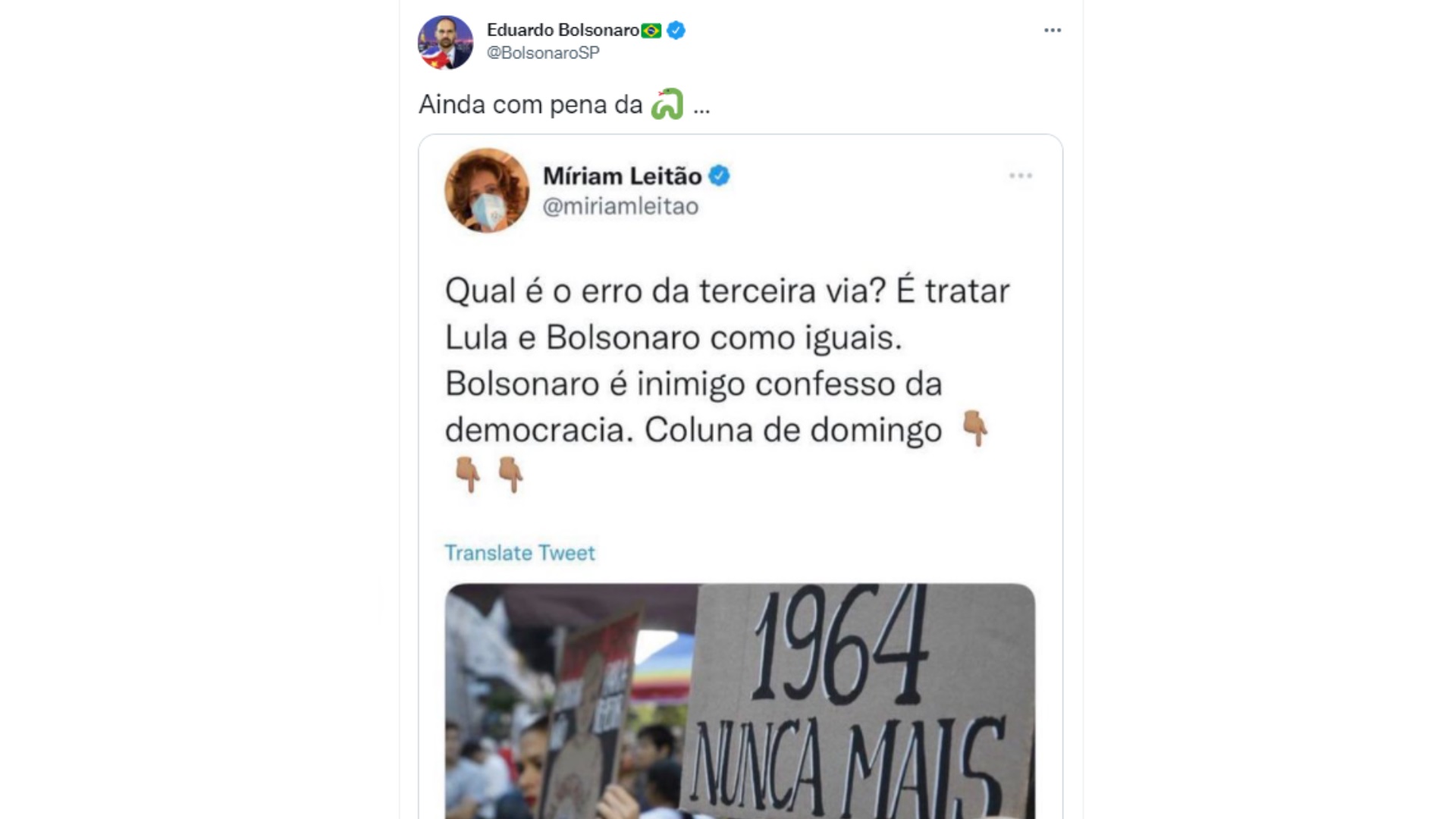 Eduardo se irritou com o texto e a atacou nas redes sociais. “Ainda com pena da cobra”, disse o filho do chefe do Executivo no Twitter. A postagem faz referência à tortura sofrida por Míriam Leitão durante o período militar. Ela foi colocada nua em um quarto escuro ao lado de uma cobra jiboia, no período em que estava grávida de seu filho.