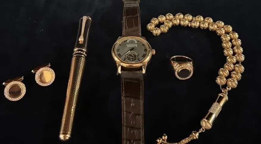 Além do relógio, o estojo incluía uma caneta, abotoaduras, anel e um rosário árabe, todos da marca suíça de diamantes Chopard.