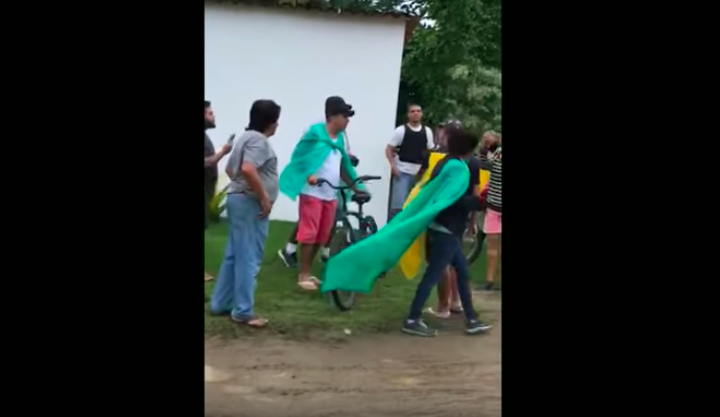 Nos vídeos, gente fantasiada de verde e amarelo grita, toca buzina de carros etc.