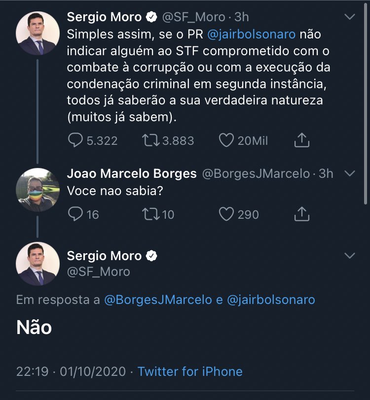 “Simples assim, se o presidente Jair Bolsonaro não indicar alguém ao STF comprometido com o combate à corrupção ou com a execução da condenação criminal em segunda instância, todos já saberão a sua verdadeira natureza (muitos já sabem)”, escreveu o ex-ministro, sem citar Marques.