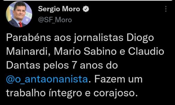O ex-juiz Sergio Moro foi às redes sociais mostrar que anda antenado com tudo. Em burrada, o agora presidenciável do Podemos chamou o site “O Antagonista” de “Antaonanista”.
