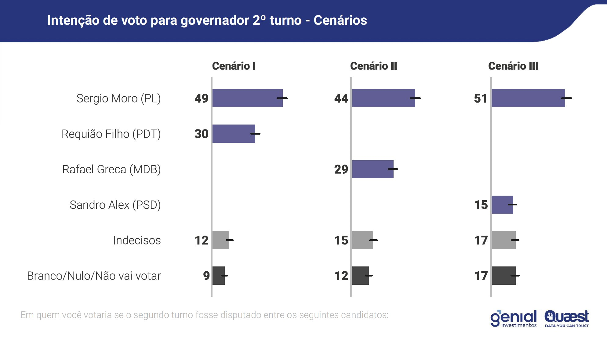 Nas simulações de segundo turno, Moro também lidera todos os cenários. Contra Requião Filho, o senador venceria por 49% a 30%. Contra Rafael Greca, teria 44%, diante de 29% do ex-prefeito de Curitiba. Já contra Sandro Alex, Moro alcançaria 51%, enquanto o candidato apoiado por Ratinho ficaria com 15%.