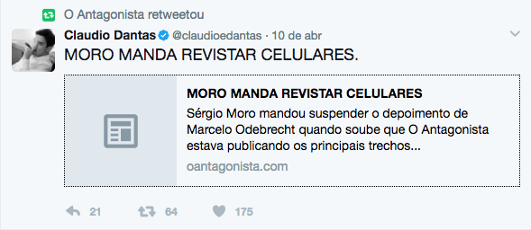 No mesmo horário da conversa, às 15h30, a máquina de vazamentos da Lava Jato operava a pleno vapor: o Antagonista, o Pravda da Lava Jato, passou a dar “furos” da delação de forma sequencial no Twitter.