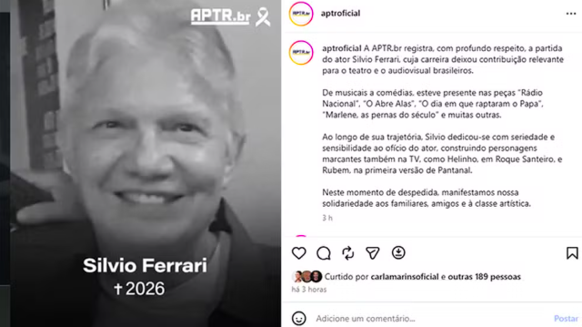O ator Silvio Ferrari morreu na última sexta-feira (16), aos 85 anos. A informação foi confirmada neste sábado (17) pela APTR, sigla da Associação dos Produtores de Teatro do Rio de Janeiro, entidade que reúne produtores e companhias e atua na defesa e promoção do teatro profissional. A causa da morte não foi divulgada.