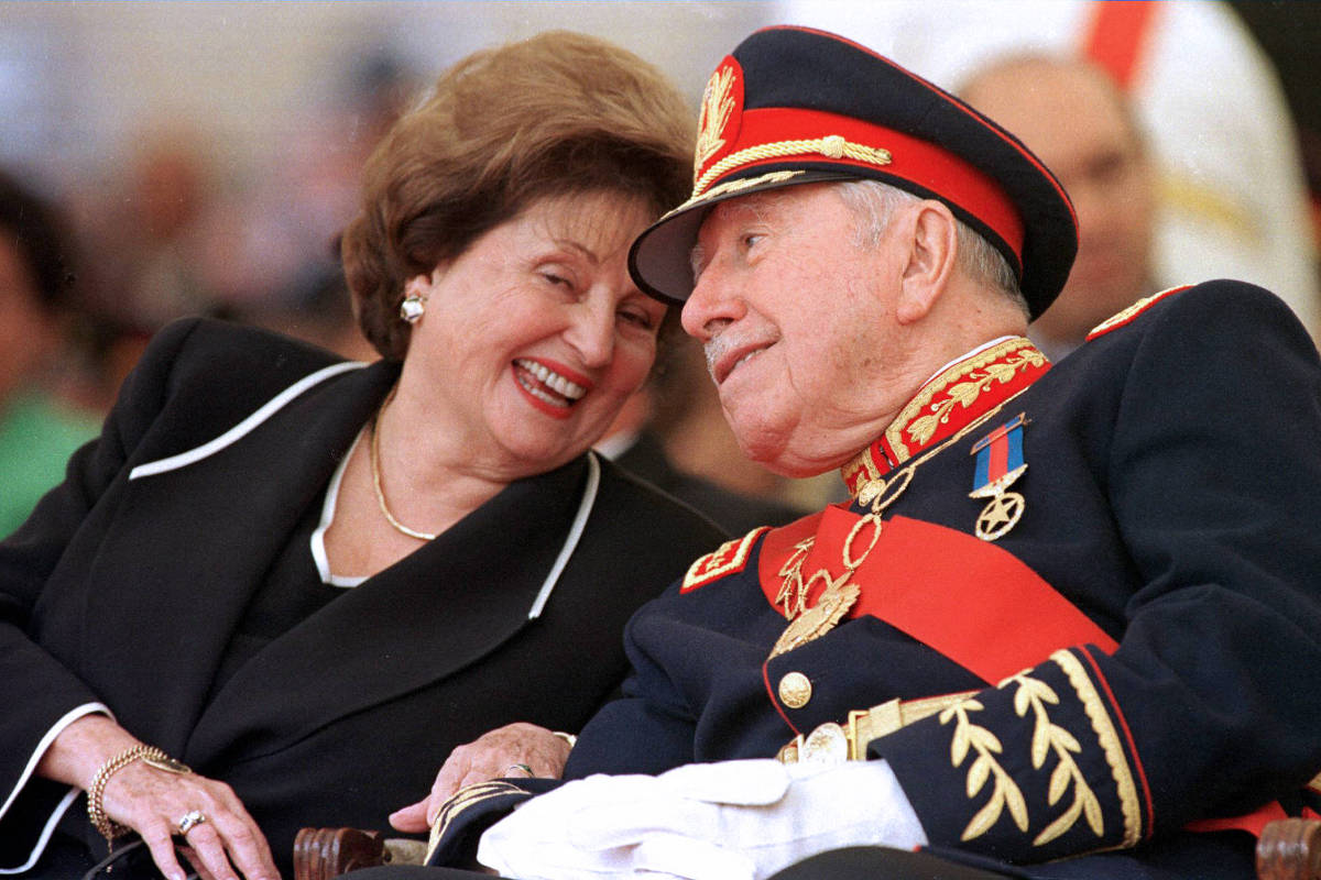 Lucía Hiriart com Augusto Pinochet em cerimônia de aposentadoria militar do ditador, em 1998.