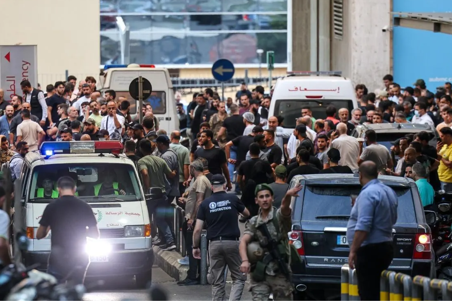 Ambulâncias são cercadas por pessoas na entrada do Centro Médico da Universidade Americana de Beirute. Foto: Anwar Amro/AFP