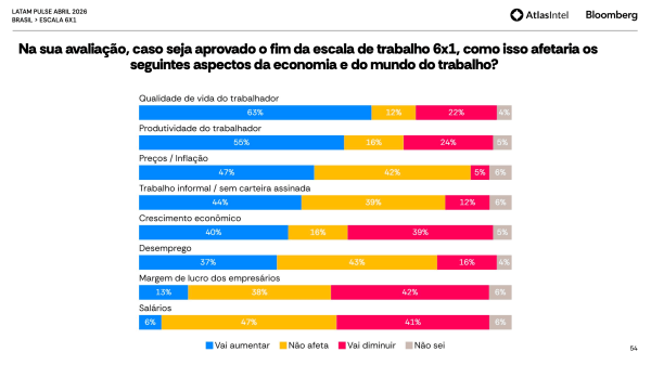 A pesquisa também abordou a tramitação de uma proposta de emenda à Constituição (PEC) para acabar com a escala de trabalho 6×1. A maioria da população apoia a medida, com 55,7% favoráveis ao fim dessa escala.