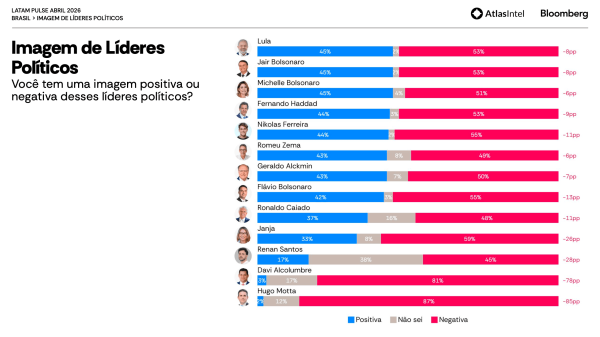 A rejeição dos parlamentares é alta, com 87% e 81%, respectivamente. Outros políticos também foram avaliados: o presidente Lula, o ex-presidente Jair Bolsonaro e a ex-primeira-dama Michelle Bolsonaro lideram as avaliações com 45% de aprovação, embora também enfrentem desaprovação majoritária, variando de 51% a 53%.
