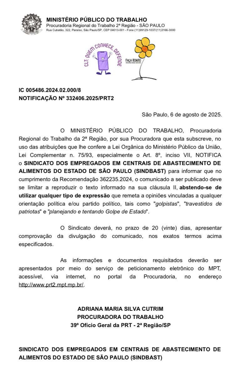 O Ministério Público do Trabalho (MPT) notificou o Sindicato dos Empregados em Centrais de Abastecimento de Alimentos do Estado de São Paulo (SINDBAST) sobre uma medida absurda.