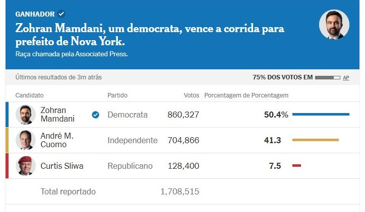 Zohran Mamdani foi eleito prefeito de Nova Iorque nesta terça-feira (4), derrotando o ex-governador Andrew Cuomo, que concorreu como independente após perder as primárias democratas em junho. A projeção é do Decision Desk HQ. Segundo projeções, com 75% dos votos apurados, Mamdani registra 50,4% dos votos, contra 41,3% de Cuomo e 7,5% do republicano Curtis Sliwa. O total reportado até o momento é de 1.708.515 votos.