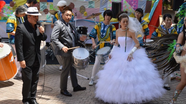 Os japoneses Fuki, 28, e Yuuichi Sahara, 36, trocaram recentemente alianças, num casamento que chamou a atenção dos convidados por causa do tema: samba.