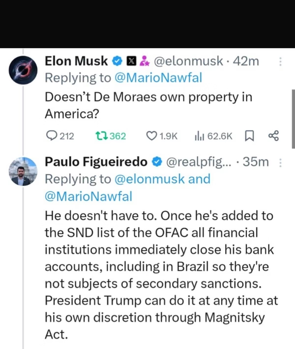 Figueiredo, que mora na Flórida, sugeriu que Moraes nem precisaria ter ativos no país para sofrer sanções, já que a inclusão de seu nome em uma lista de pessoas sob restrições permitiria que bancos estadunidenses vetassem a abertura de contas em seu nome. Musk respondeu com um simples “interessante”.