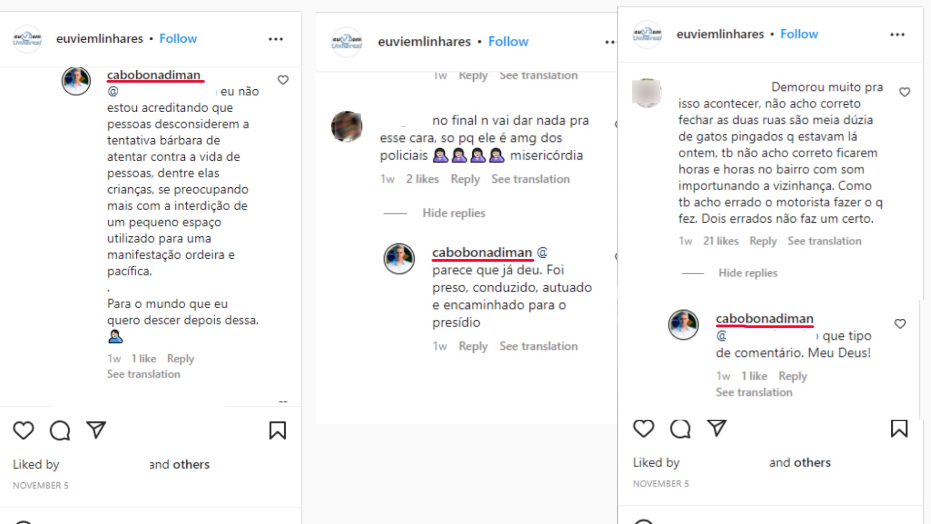 Um dos comentários mais curtidos do post, que chama os manifestantes bolsonaristas de “gatos pingados” e diz que eles estavam “importunando a vizinhança”, revoltou o PM. “Que tipo de comentário. Meu Deus!”, respondeu. Os bolsonaristas haviam desrespeitado a determinação do ministro Alexandre de Moraes, presidente do Tribunal Superior Eleitoral (TSE), para desobstruir rodovias.