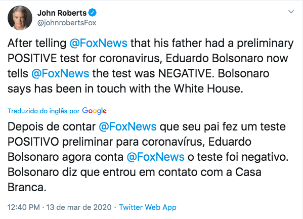 “Hoje, mais cedo, Eduardo Bolsonaro confirmou relatos de que seu pai havia testado positivo para coronavírus na FOX News e disse que estava esperando por mais testes. Mais tarde, ele apareceu na FOX News e afirmou que seu pai havia testado negativo para coronavírus”.