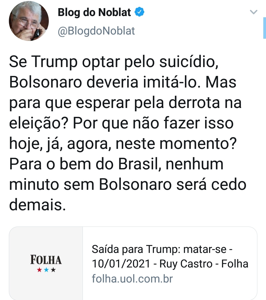 Noblat compartilhou um trecho sem aspas: “Se Trump optar pelo suicídio, Bolsonaro deveria imitá-lo. Mas para que esperar pela derrota na eleição? Por que não fazer isso hoje, já, agora, neste momento? Para o bem do Brasil, nenhum minuto sem Bolsonaro será cedo demais”.