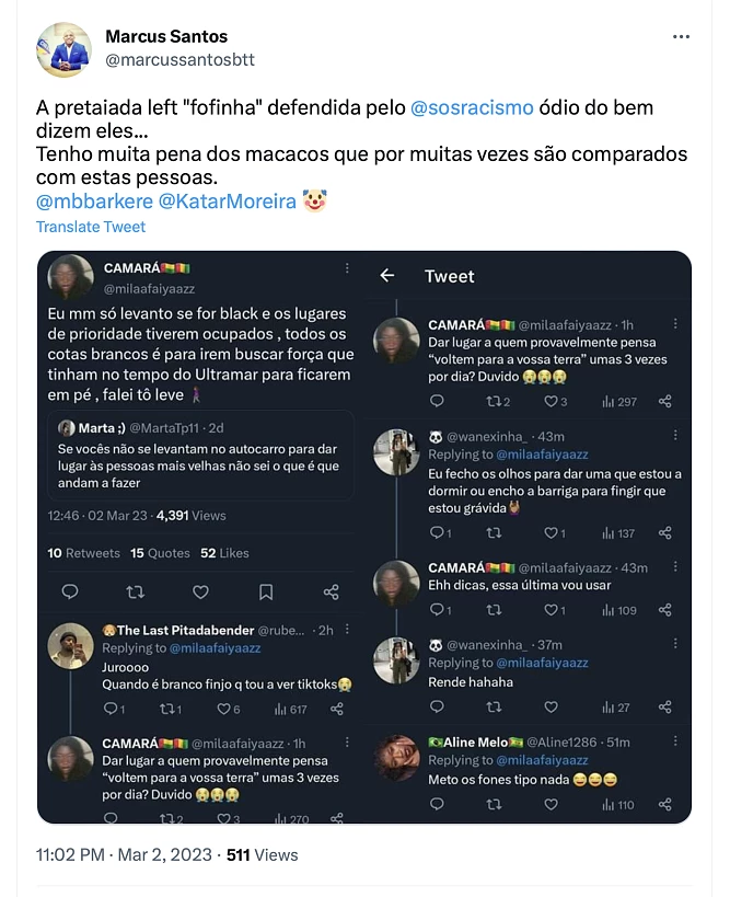 Mais recentemente, ele atacou a “pretaiada left ‘fofinha’: “Tenho muita pena dos macacos que por muitas vezes são comparados com estas pessoas”.