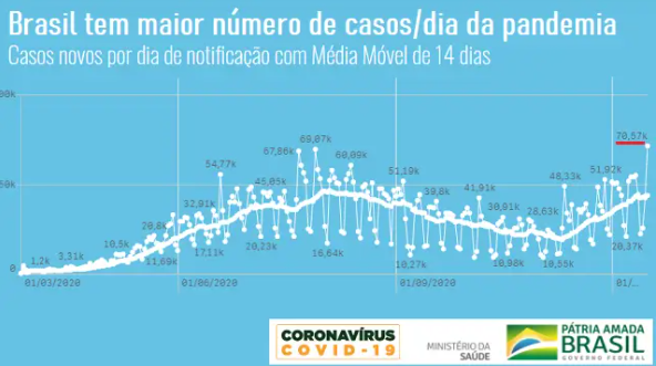 Pior ainda, o número de novos casos confirmados alcançaram a marca de 70.574 , que é, na contagem oficial do Ministério da Saúde, o maior número atingido em todos os nove meses da pandemia, como você vê no gráfico acima.