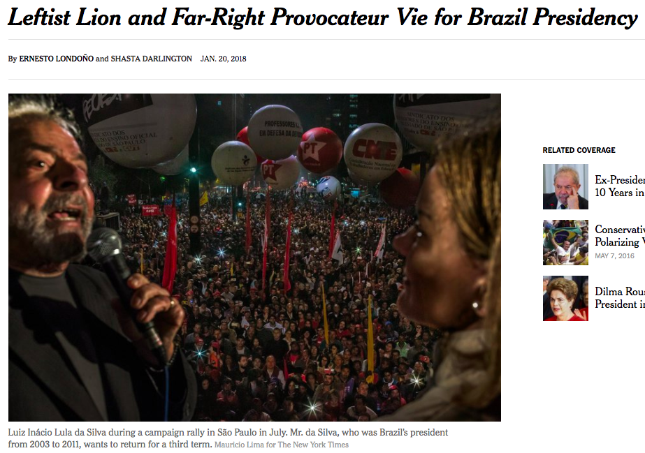 A ascensão do Sr. Bolsonaro atordoou os brasileiros , alguns dos quais o consideram como um sintoma de quão está aflita é a quarta maior democracia do mundo. Uma base de fervorosos apoiadores, no entanto, vê o impetuoso ex-oficial militar, uma vez que a solução radical precisava virar a sorte de uma nação incomodada pelo aumento da violência, uma epidemia de falcatruas e uma recuperação desigual de uma recessão econômica prolongada.”