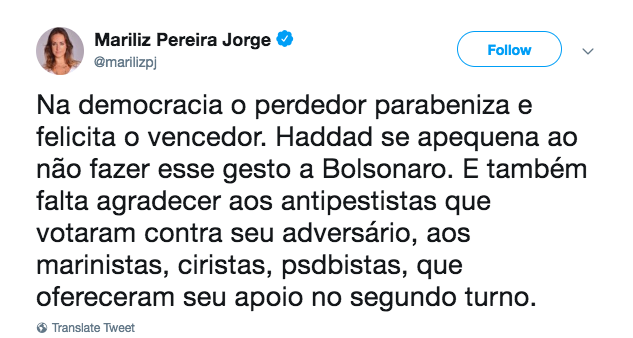 “O processo eleitoral democrático também recomenda que o derrotado felicite o vencedor de público. E cedo. Vacilou feio, Haddad”, decretou.