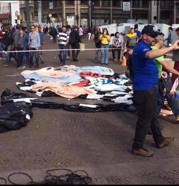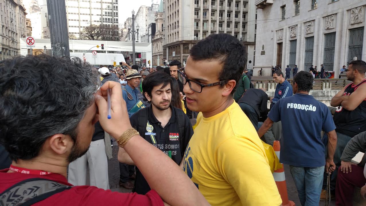“Foi uma manifestante esquerdista que veio e rasgou o nosso boneco. Ela fez dois rasgos na altura do peito dela, sendo que ela tem mais ou menos 1m70. Nós erguemos o boneco diante da prefeitura de São Paulo e eles cometeram esse ato criminoso”, disse Henrique, do Movimento nas Ruas Contra a Corrupção, que tem 24 anos.