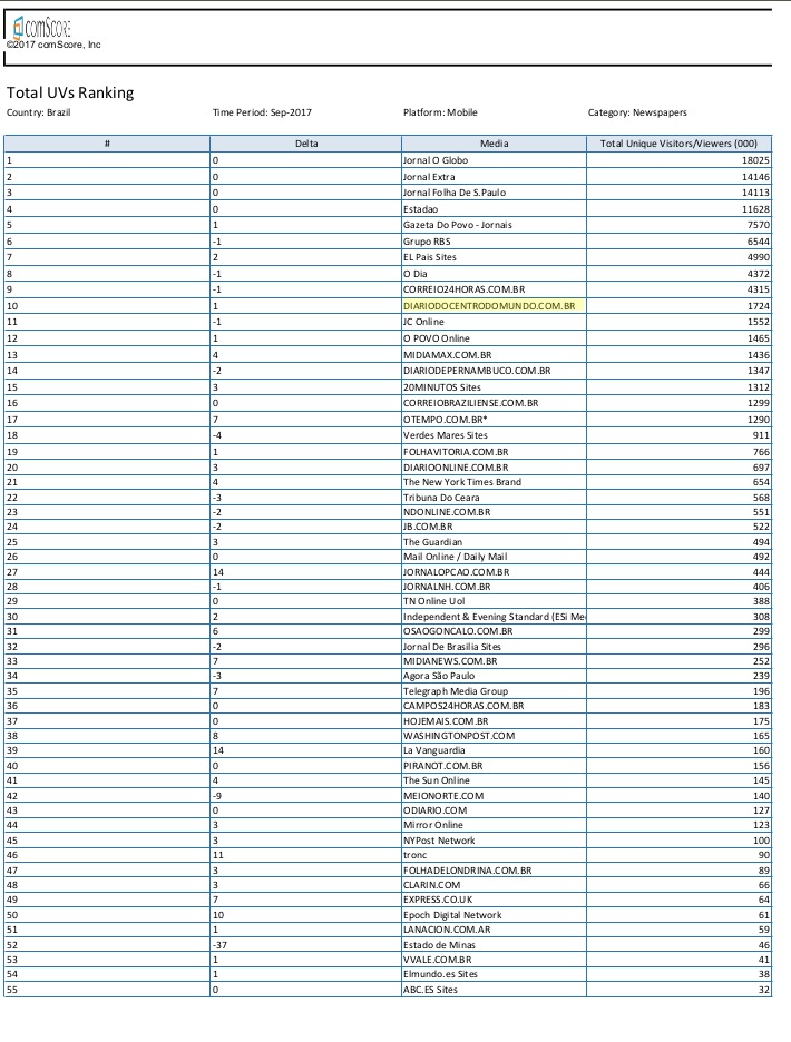 Segundo dados da comScore de setembro (os mais recentes disponíveis), tida como o melhor provedor de medição de audiência digital no mundo, o DCM está na 10ª posição entre os sites mais acessados do Brasil na categoria “newspaper” e que utilizam a plataforma mobile.