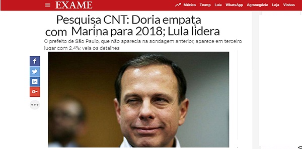 Voz econômica da Editora Abril, “paga o mico” dos enamorados e publica a chamada: Pesquisa CNT: Doria empata com Marina para 2018.