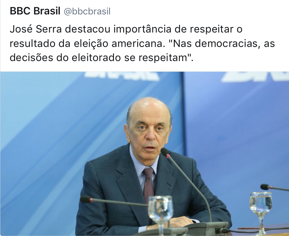 Nele, aparece uma foto de Serra com a seguinte declaração pós-vitória de Trump: “Nas democracias as decisões do eleitorado se respeitam.”